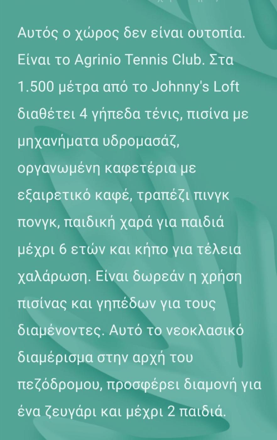 Set in Agrinion, 26 km from Trichonida Lake and 37 km from Messolonghi Lake, Johnnys loft offers air-conditioned accommodation with a balcony and free WiFi. The accommodation features a lift and private check-in and check-out for guests.