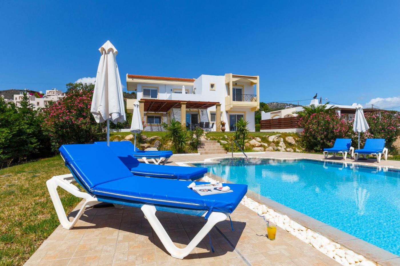 Three-Bedroom Villa with Sea View. Featuring a private swimming pool and sun terrace, this modernly furnished, split-level villa opens to a balcony and patio with Aegean Sea, pool and garden views. It offers: -3 air-conditioned bedrooms -a fully equipped kitchen with dining area -a living room with a satellite, flat-screen TV and DVD player -a washing machine and ironing facilities -free WiFi.