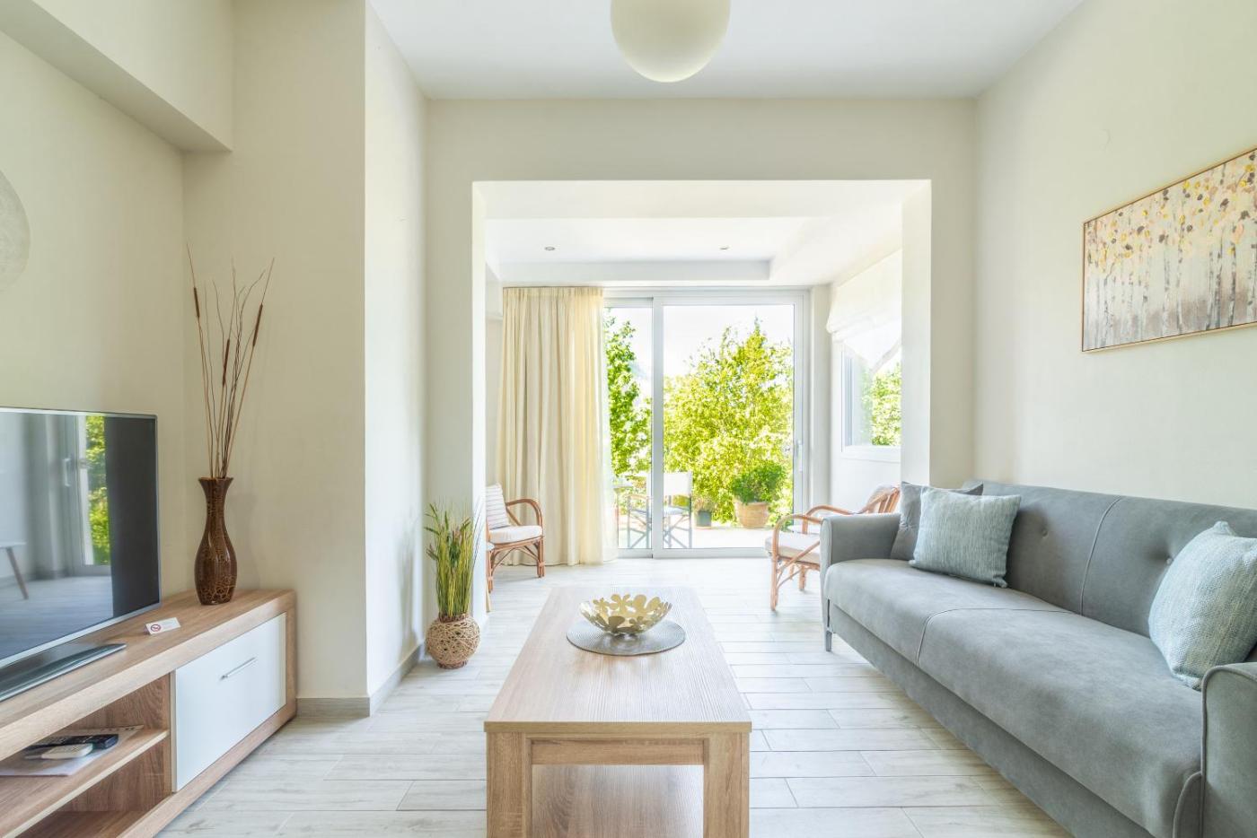 One-Bedroom Apartment. Boasting a private entrance, this air-conditioned apartment includes 1 living room, 1 separate bedroom and 1 bathroom with a walk-in shower and a hairdryer. Guests will find a stovetop, a refrigerator, kitchenware and an oven in the fully equipped kitchen. The apartment also features a barbecue. The unit has a washing machine, garden views, a terrace and winechampagne is offered for guests. The unit has 2 beds.
