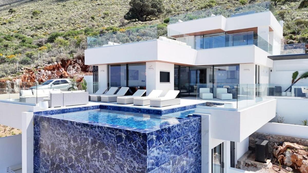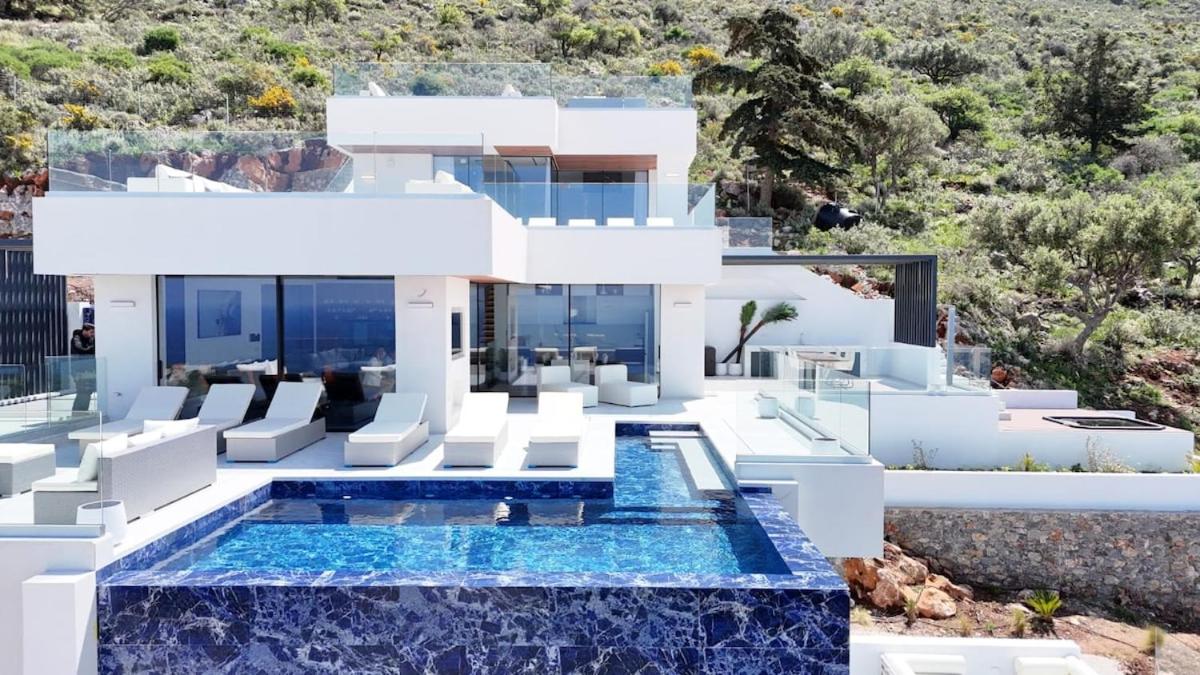 The villa has 4 bedrooms, a flat-screen TV, a fully equipped kitchen with a microwave and a fridge, a washing machine, and 5 bathrooms with a hot tub.