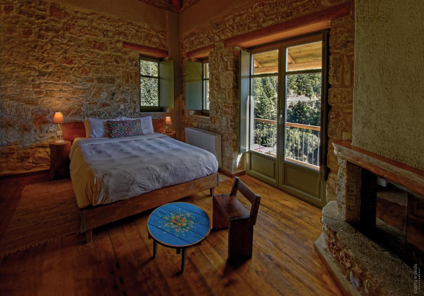 Deluxe Double Room with Balcony and Fireplace. Offering views over the lush greenery of Mount Parnonas, this traditionally decorated room has beamed ceilings and stone walls. Most units come with a furnished balcony, while some of them are split level. Guests are offered a late checkout. ;